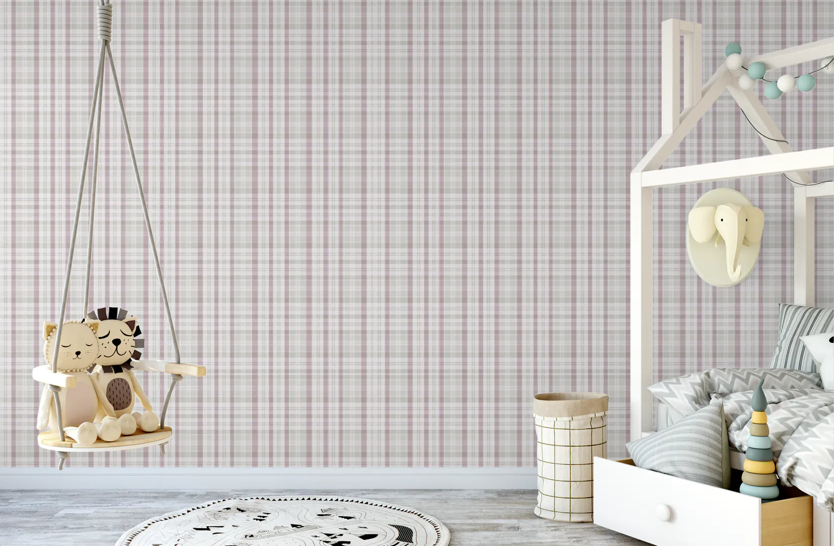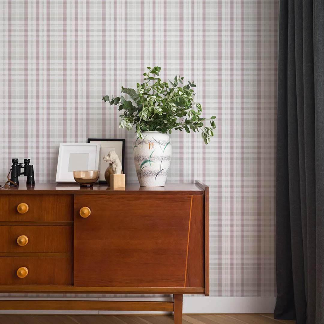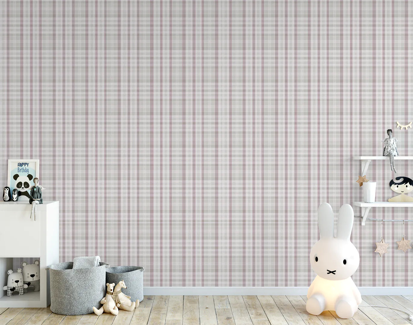 Tartán Sutil" es un papel pintado que presenta un diseño de tartán en tonos grises, perfecto para un estilo sutil y sofisticado.