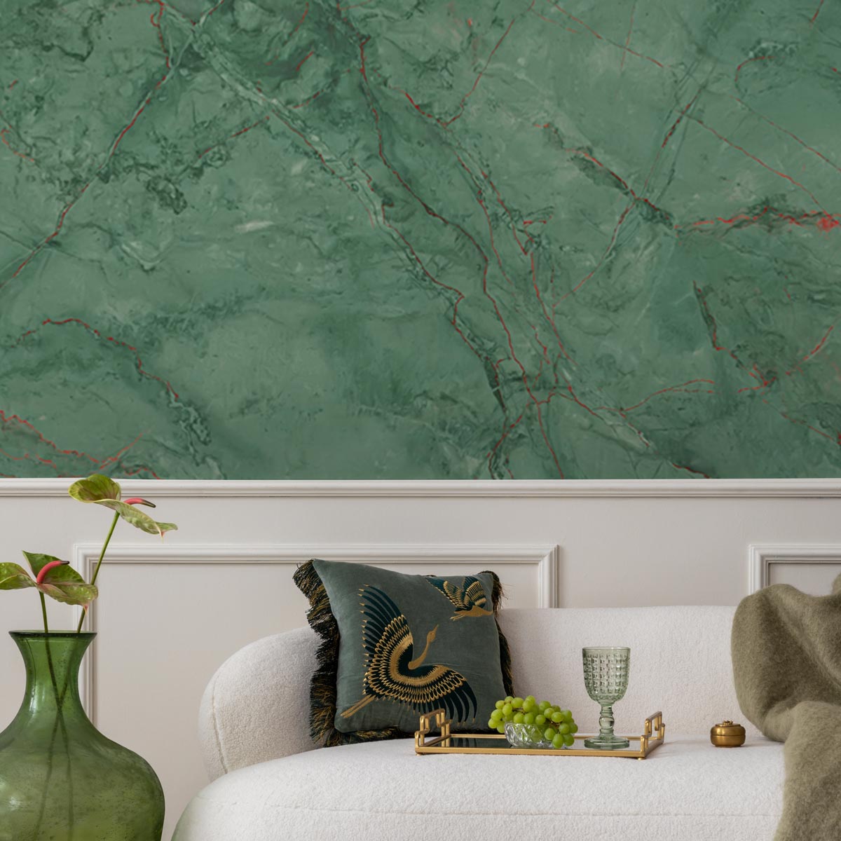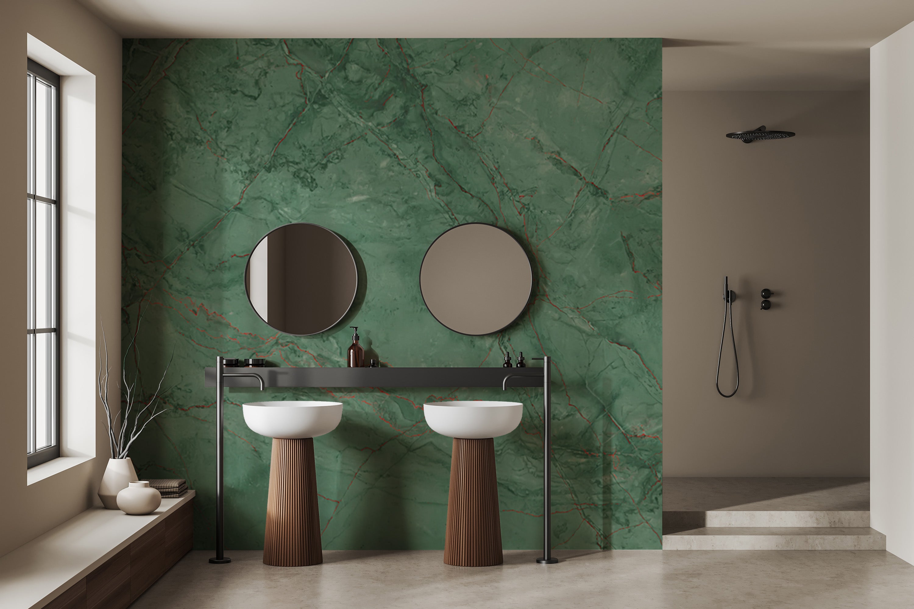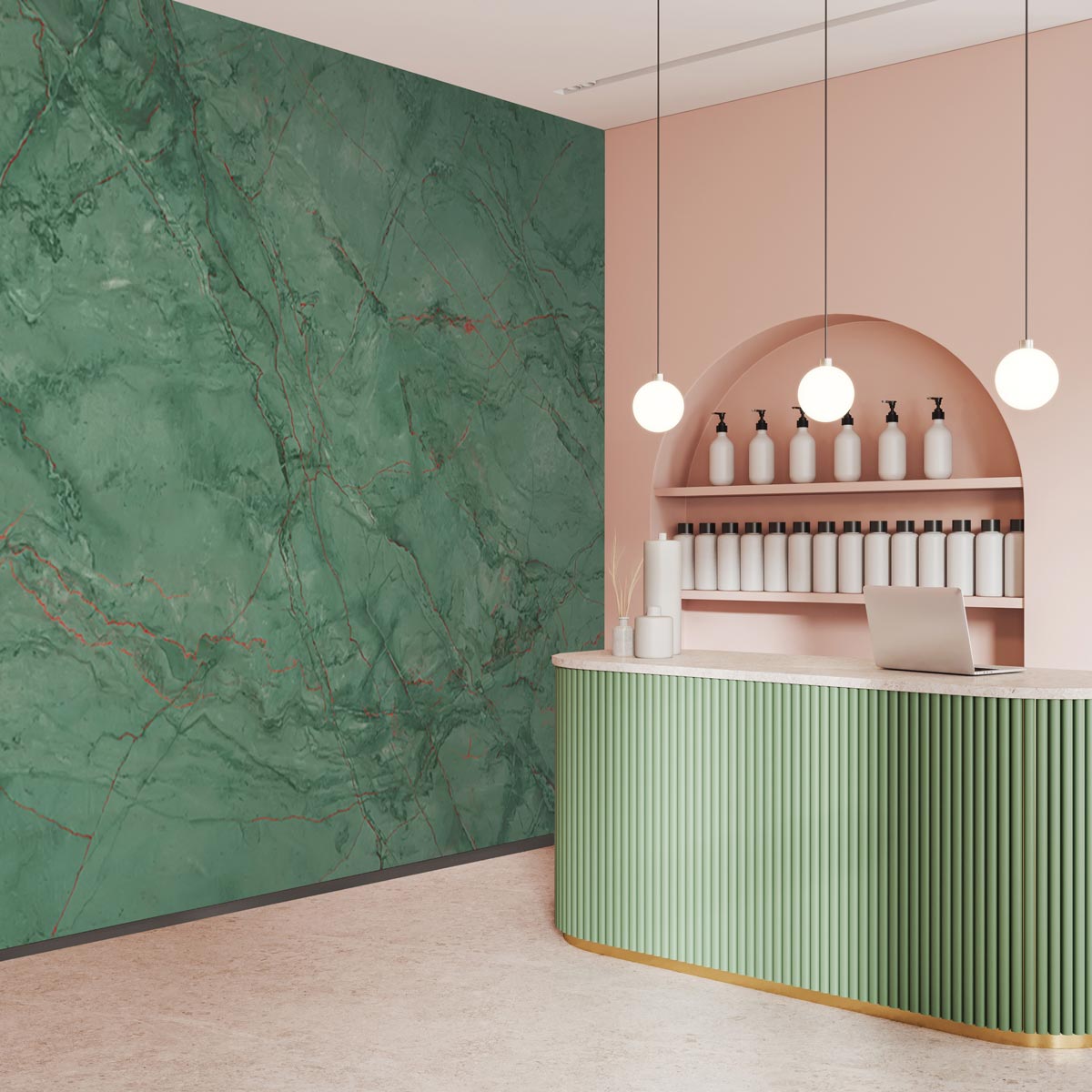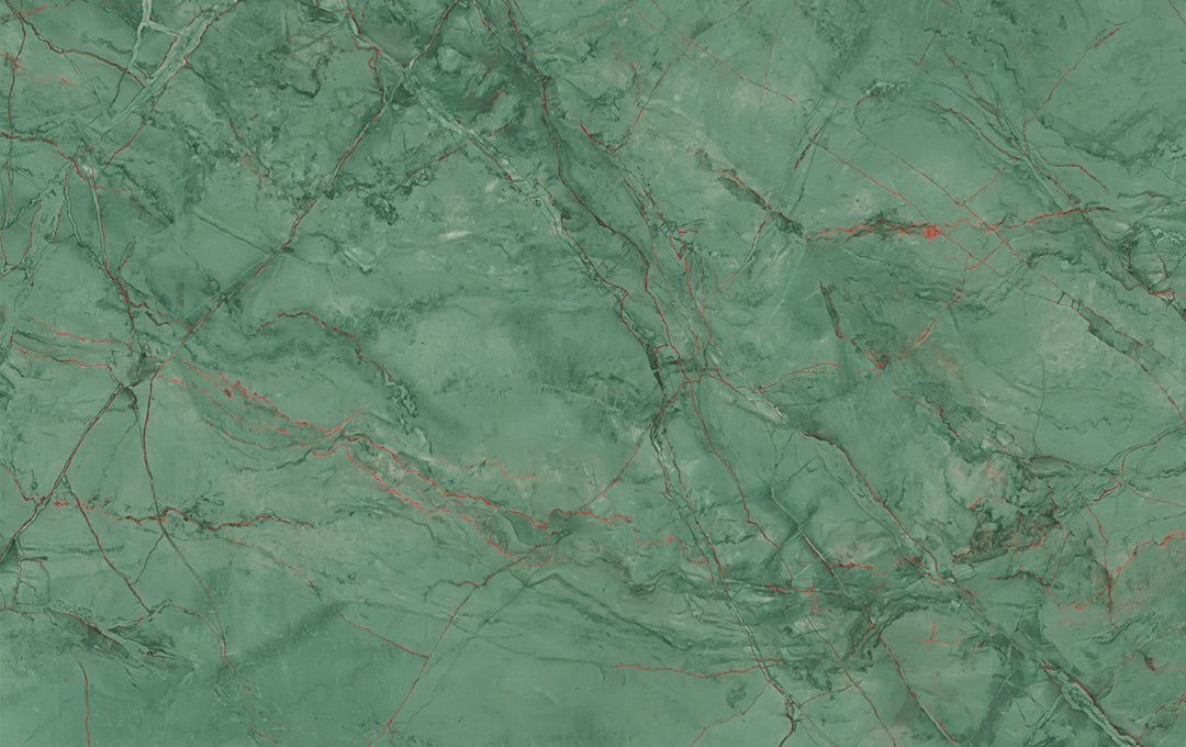 "Venación Esmeralda": Este diseño de mármol verde con vetas rojizas ofrece un toque vibrante y elegante, ideal para inyectar vida y color en cualquier espacio residencial o comercial que busque distinción y frescura.